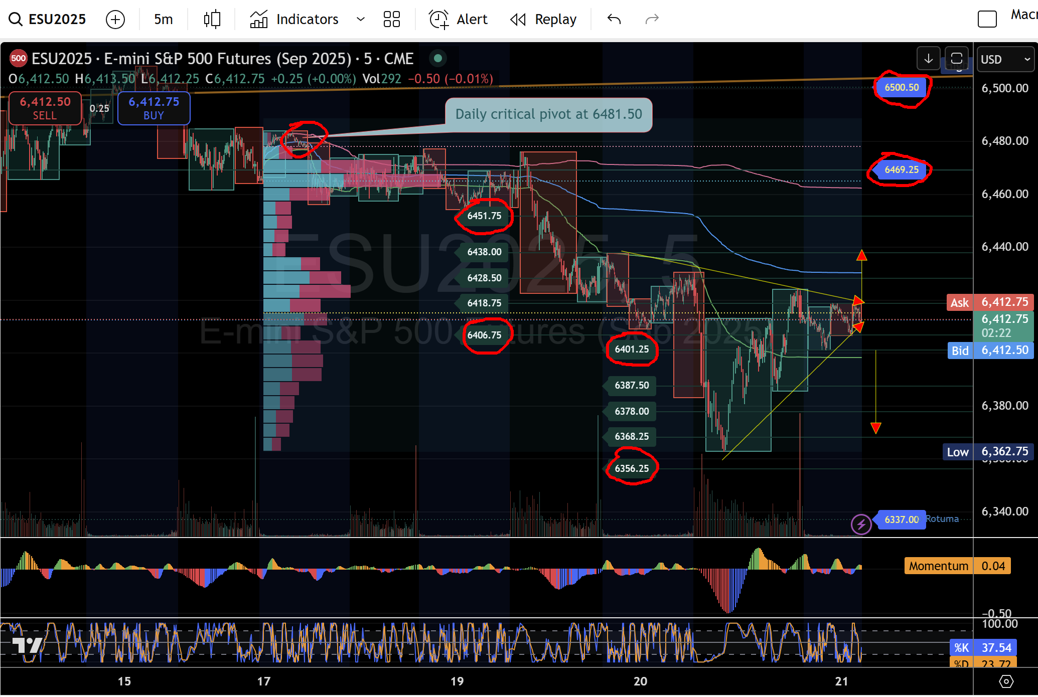 - Top cluster/failure zone: 6,500.50 → 6,469.25 (beneath the daily pivot 6,481.50).