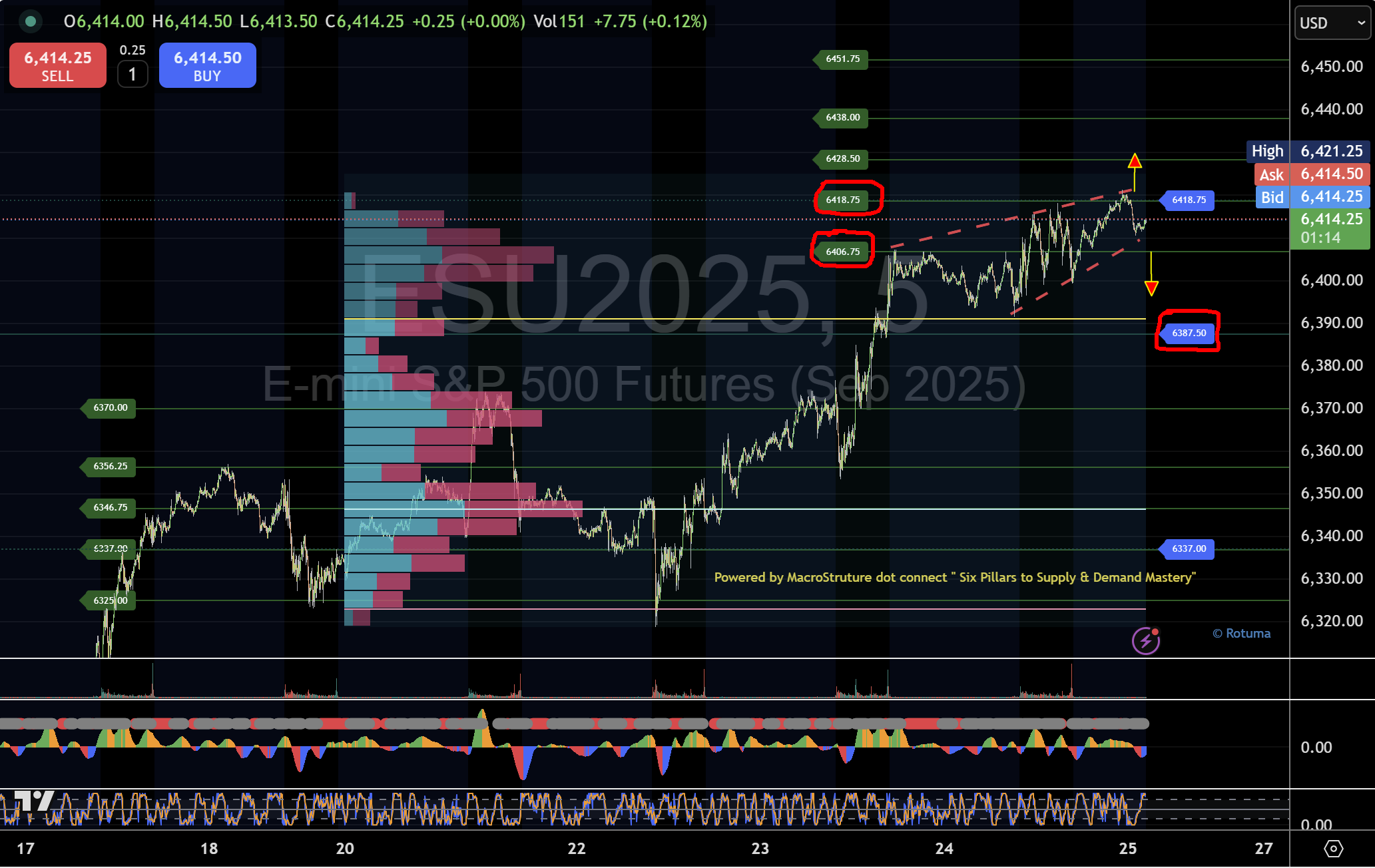 Volume Profile Confluence: Weekly volume‑at‑price shows significant trade density around the 6,380–6,390 area, reinforcing Pivot 5 (6,387.50) as a linchpin for both bulls and bears.