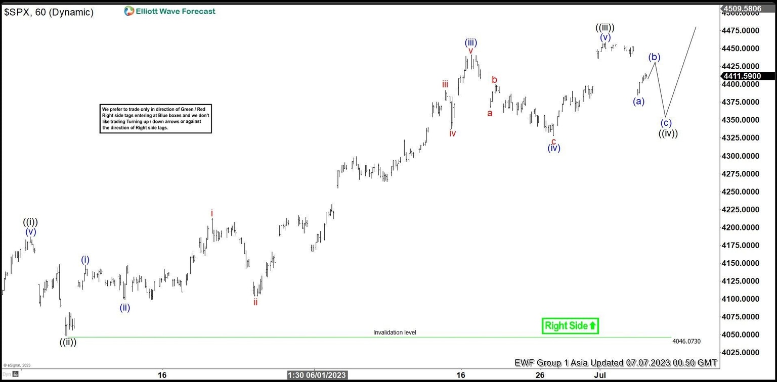 Final leg higher wave (v) ended at 4458.48 which completed wave ((iii)). Pullback in wave ((iv)) is in progress to correct cycle from 5.4.2023 low in 3, 7, or 11 swing. Down from wave ((iii)), wave (a) ended at 4385.05. Expect wave (b) rally to fail below 4458.48 and the Index to turn lower in wave (c) before it completes wave ((iv)) and resumes higher. Wave ((iv)) typically ends somewhere at the 23.6 – 38.2% Fibonacci retracement of wave ((iii)). That area is at 4301.2 – 4361.1. From here, the Index can find buyers for further upside. Near term, as far as pivot at 4046.07 low stays intact, expect pullback to find support in 3, 7, or 11 swing for further upside.
