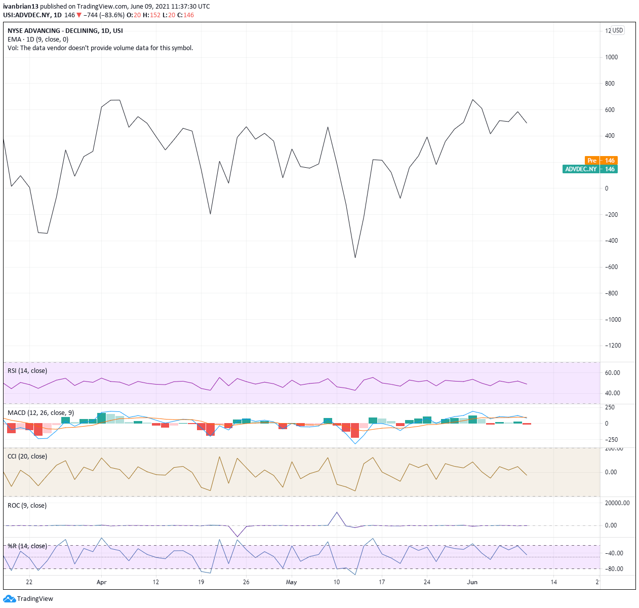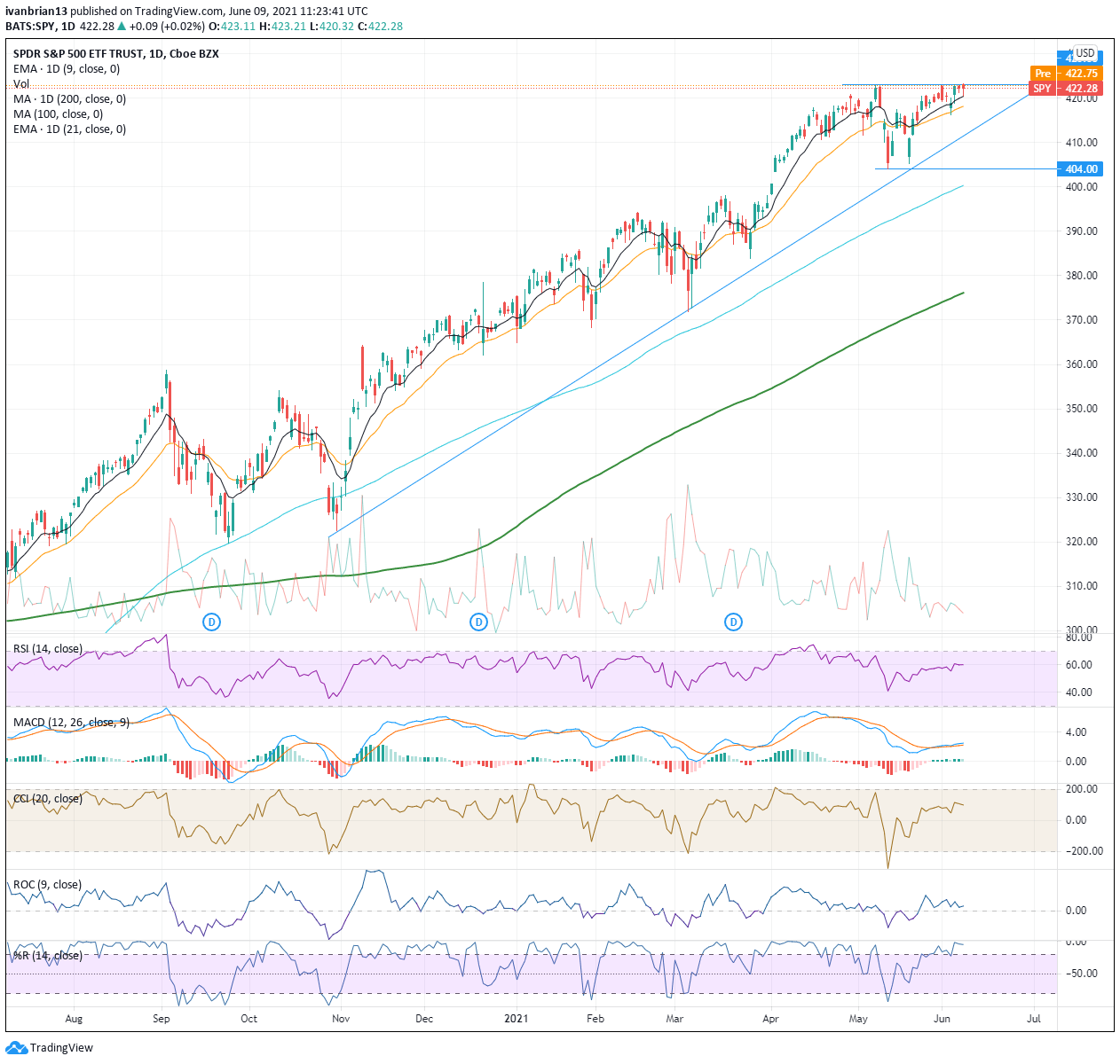 The double bottom in place from May 12 and 19 corresponds nicely with the double bottom we spoke of in Tuesday's Nasdaq overview, see more. It always gives extra credence to the levels when the indices align. The strength or lack thereof in the current trend is identified by the Moving Average Convergence Divergence (MACD) indicator being horizontal and gapless. Last week's Thursday wobble held perfectly at the 21-day moving average and the trend, as can clearly be seen, has been using the 9-day moving average quite well. In the SPY ETF, the low from June 3 is a pivot for the very short term at 416.28. Below that, 404 is the long-term pivot.