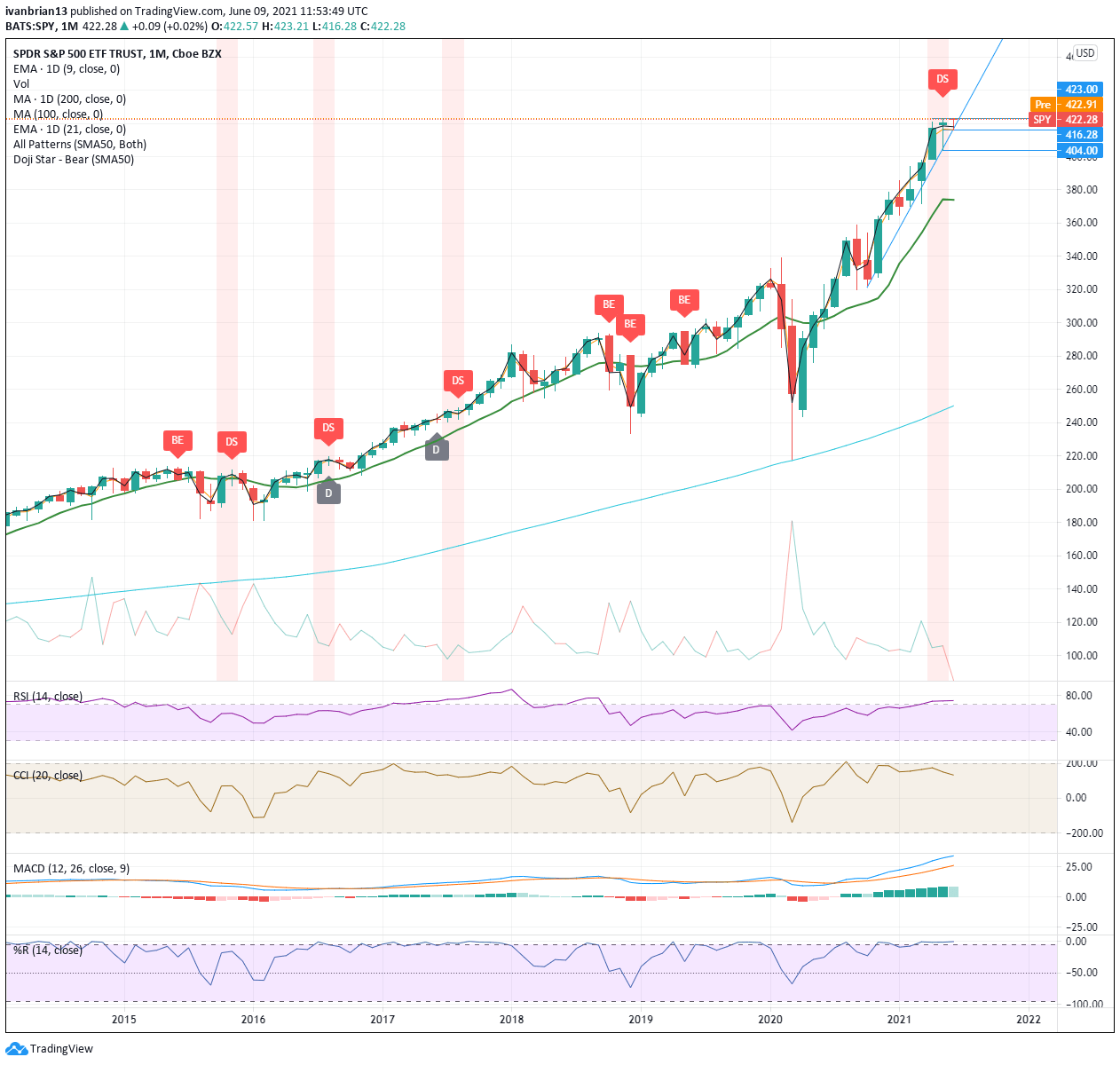 A little bit of caution can be taken from the long-term monthly S&P 500 ETF (SPY). This shows a bearish doji star candlestick from May. A doji star is a reversal candle where the previous long green candle is followed by a long doji with an open and close above the previous long green candle. Not always perfect, but it is definitely worth watching. As can be seen, they have not been working that well given the relentless uptrend but can signify some modest pullbacks or slowdown in the uptrend. The monthly Relative Strength Index (RSI) is also just barely in overbought territory.