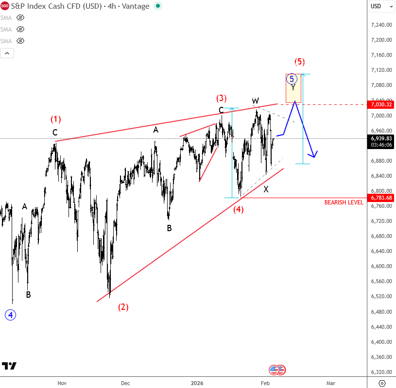 S&P 500 moved very nicely higher from the November lows and recently reached new all time highs before turning slightly lower in the last few sessions. This pullback raises the question of whether the index is already running into more serious resistance up here, especially as we are seeing overlapping price action, which looks like an ending diagonal. It may be too soon to call a top, but it is important to be aware of a potential STRONG reversal in the weeks ahead, which is often the case once an ending diagonal is completed. Looking at the latest price move more detailed, seems like wave (5) is already here, but can retest the upper line once again, near 7050. Drop below 6783, will be very bearish.