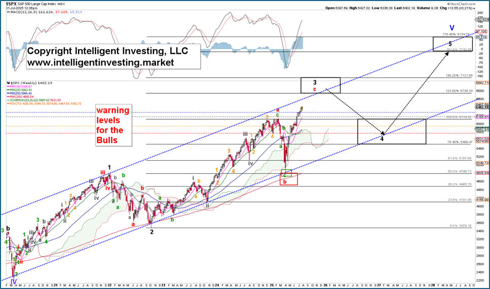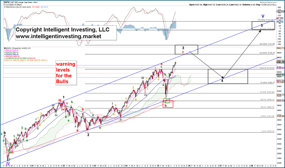 Although the previous June alignment worked perfectly, the index overlooked July's movement and simply rallied nonstop. We can call that miss “60% of the time it works every time,” which is common in financial markets. No big deal, since the index never dropped below our key warning levels of $6177 and $6061 set back then, so we stayed long comfortably. However, now that the $6380-6460 zone has been reached, and since price is the ultimate judge—though timing can sometimes help—the index is in a range where a pullback is more likely to start.
