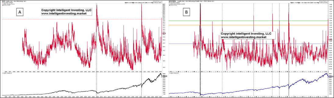 The Volatility Index (VIX), aka the “fear gauge,” which measures the market's expectations of 30-day volatility for the S&P500 (SPX), had its 3rd highest reading in early April (52.3) since data became available in 1989. See Figure 1A below. The two prior occasions were during the 2008 bear market and the 2020 COVID-19 crash. Besides, when we include the 3-month Volatility Index (VXV) and make a ratio (VIX/VXV), we can identify more lows with spikes above 1.25. Earlier this month, the ratio spiked to 1.274 and now sits at 1.028. Although not all occasions were “the low,” all were excellent buying opportunities.
