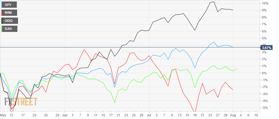 Taking the chart below as a clearly identifiable uptrend, one may notice some key divergences are in play. First, we have a Relative Strength Index (RSI) bearish divergence. The SPY stock has continued to make new highs, but the RSI has not. A similar situation exists in the Moving Average Convergence Divergence (MACD). Here is a bearish divergence of a downtrend, while the SPY stock is in an uptrend. Having two indicators line up like this gives extra credence to the argument. The last dip on July 19 had little volume, so any move lower toward this should see an acceleration due to lack of volume support. Break $433 and it is on for a swift move to $420. This zone from $410 to $420 becomes our buy-the-dip target with strong volume-based support here. $414.70 is the main support – the low from June 18.