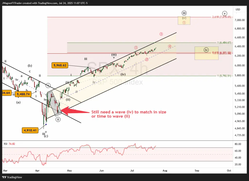 The SPX chart follows an incomplete Elliott Wave impulse pattern as the market continues its climb in wave ((iii)).