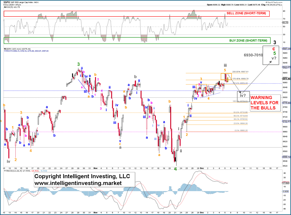 “…Therefore, November 12 was the Wave b of Wave 4, and last Friday ended the W-c of the (green) W-4 correction. Additionally, the correction this month best qualifies as a (double) zigzag, while the April 10-21 correction best qualifies as a flat, which meets the EW’s “rule of alternation”. Thus, contingent on the SPX holding above last Friday’s low at 6521, with a serious warning for the Bulls below 6630 (Monday’s low), we can allow for the index to rally to 7120+.”