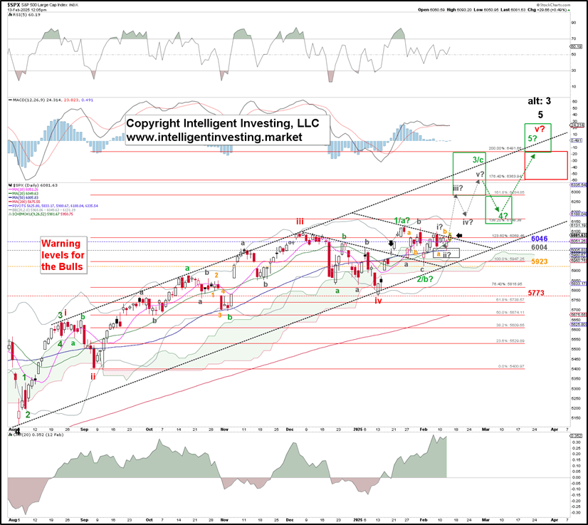 What would that be? A break below the third (orange) warning level—the February 3 low at $6003, for starters, but ultimately, the January 13 low at $5773 remains the Bull-Bear line in the sand. If the market decides to move below these levels, our preferred EW count is wrong. But that’s our alternative, our insurance.