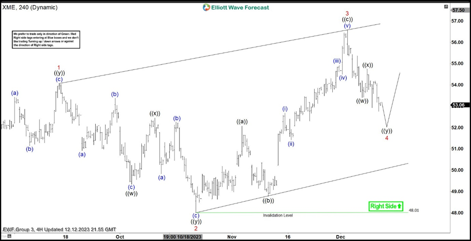 In today’s article, we will look at the past performance of the 4H Hour Elliott Wave chart of SPDR Metals & Mining ETF ($XME). The rally from 10.23.2023 low at $48.01 broke above 09.15 peak creating a bullish sequence. So, we expected the pullback to unfold in 7 swings and find buyers again. We will explain the structure & forecast below: