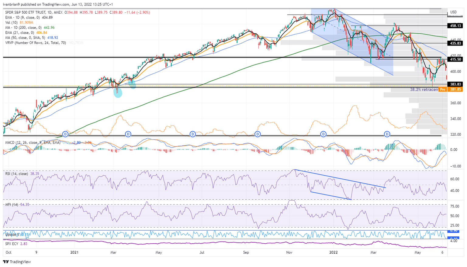 The SPY will open lower on Monday and likely right at the key Fibonacci retracement at $380. This becomes the last chance saloon to avoid an official bear market. Given current sentiment, it is unlikely to hold. Fed speakers will take to the airwaves this week and will be more hawkish. The yield curve has inverted this morning, and the US 2-year yield is up another 16 basis points.