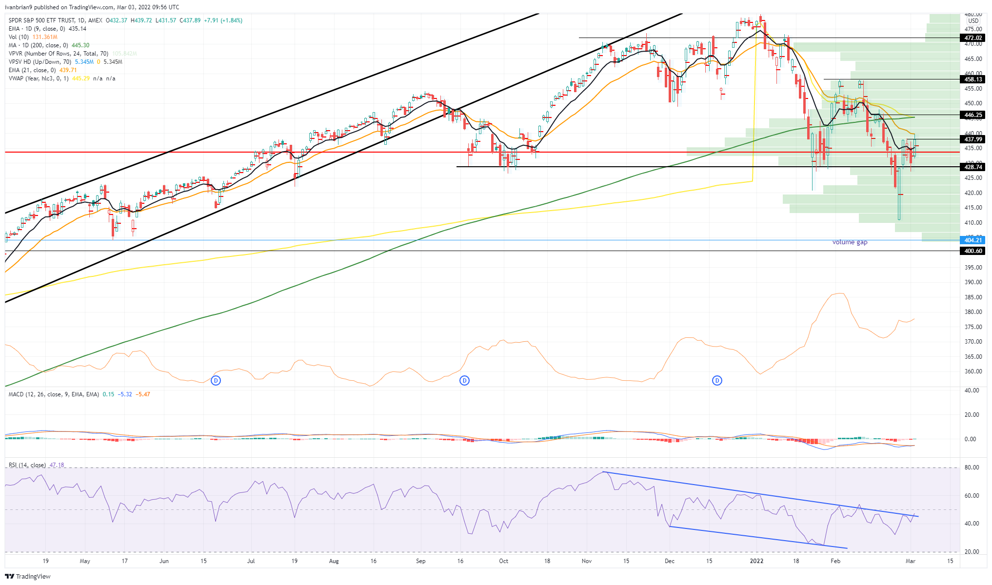 We have previously pointed out the predictive nature of the US yield curve in forecasting a coming recession. The curve continues to flatten despite falling yields. Bond traders are usually more macro-orientated than their equity brethren, and they are taking an increasingly dim view of prospects for the US economy. The move yesterday stopped at our resistance at $438, and this remains the pivot for today. Above and we can think of $446, but below and it is back to bearish moves. Longer-term the outlook remains challenging with a test of $400 looking increasingly likely. Slowing growth, soaring energy and inflation will eventually hit sentiment again.
