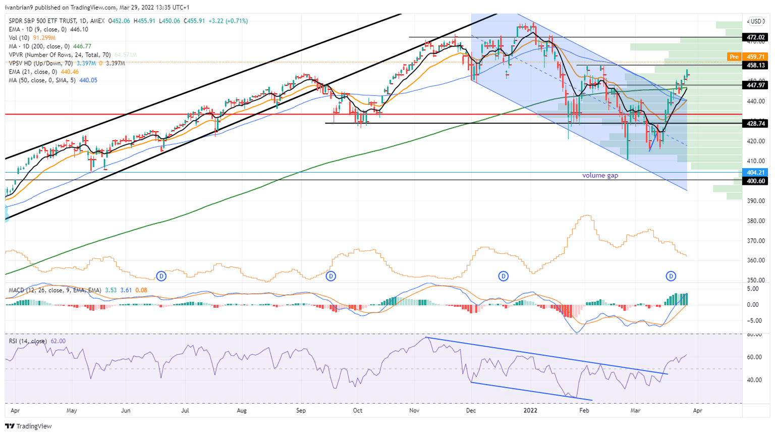 A huge level is incoming at $458 that foreshadows huge resistance. The double top from February was a perfect bearish signal. Now we have a near-perfect complete retracement. Will bears return to defend the level? A break above will see technical all-time highs likely. Failure and the first support is at $446 from the 200-day moving average.