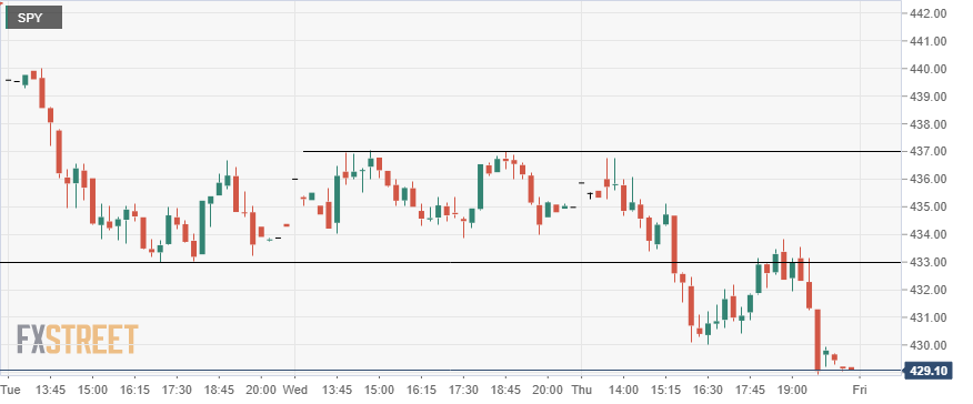 Look at that ugly 15-minute chart above. Yesterday (Thursday) before the open we identified $433 as being key for the day: "Below look for further losses but opening above can lead us to retrace a bit and test the 9-day moving average at $439." Well, the SPY did open above but failed to make much headway, topping out early at $437 and so failing to retake the 9-day moving average. This $437 top also worked well on Wednesday, and the failure led the SPY back to our $433 level and pivot for the day. Once below, we got the perfect retest and failure, closing at $429.
