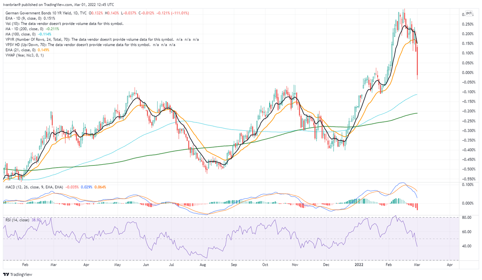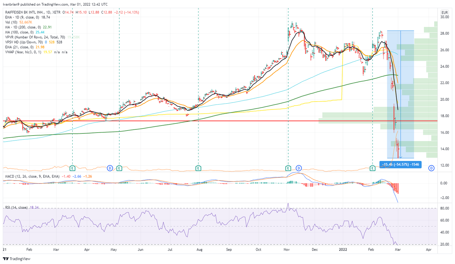 Oil prices remain on high alert as do gas prices in Europe. European stock markets remain the most affected with Germany's Dax the big loser so far among the major indices. Austrian and Italian banks with high exposure to Russian counterparts also helped European equities drop lower on Monday and again on Tuesday. Raiffeisen Bank is generally regarded as having the highest exposure to Russia and has seen its share price decline by over 50% (see chart below).