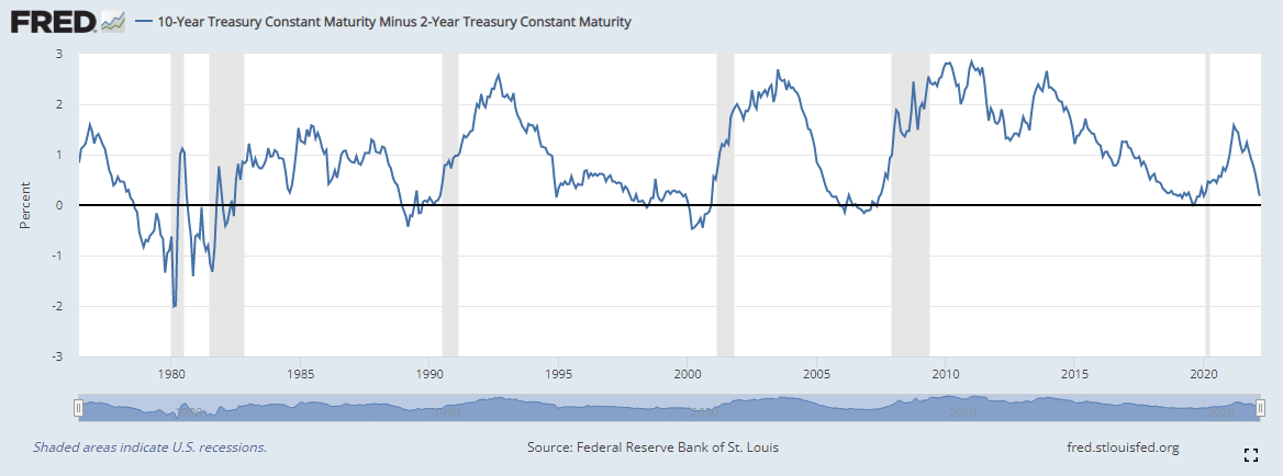 Equity markets quickly turned on their heels on Monday and reversed course once Fed Chairman Powell took to the airwaves. A surprisingly hawkish tone saw yields spike and money markets add in an extra hike to the previously predicted seven hikes for 2022. Yields rose, and the yield curve is now within touching distance of inversion. As mentioned before, the yield curve has a 100% record of predicting US recessions for the past 50 years. Below is data from the Federal Reserve of St. Louis showing the yield curve below zero and the resulting US recessions in grey. Data is back to 1976. We can see now with the yield curve down to 17 basis points just how close it is to predicting an imminent US recession. We should also note research pointing out that the Fed hoped for a soft landing to control inflation rarely if ever pans out. Recessions are a surefire way to curtail inflation.