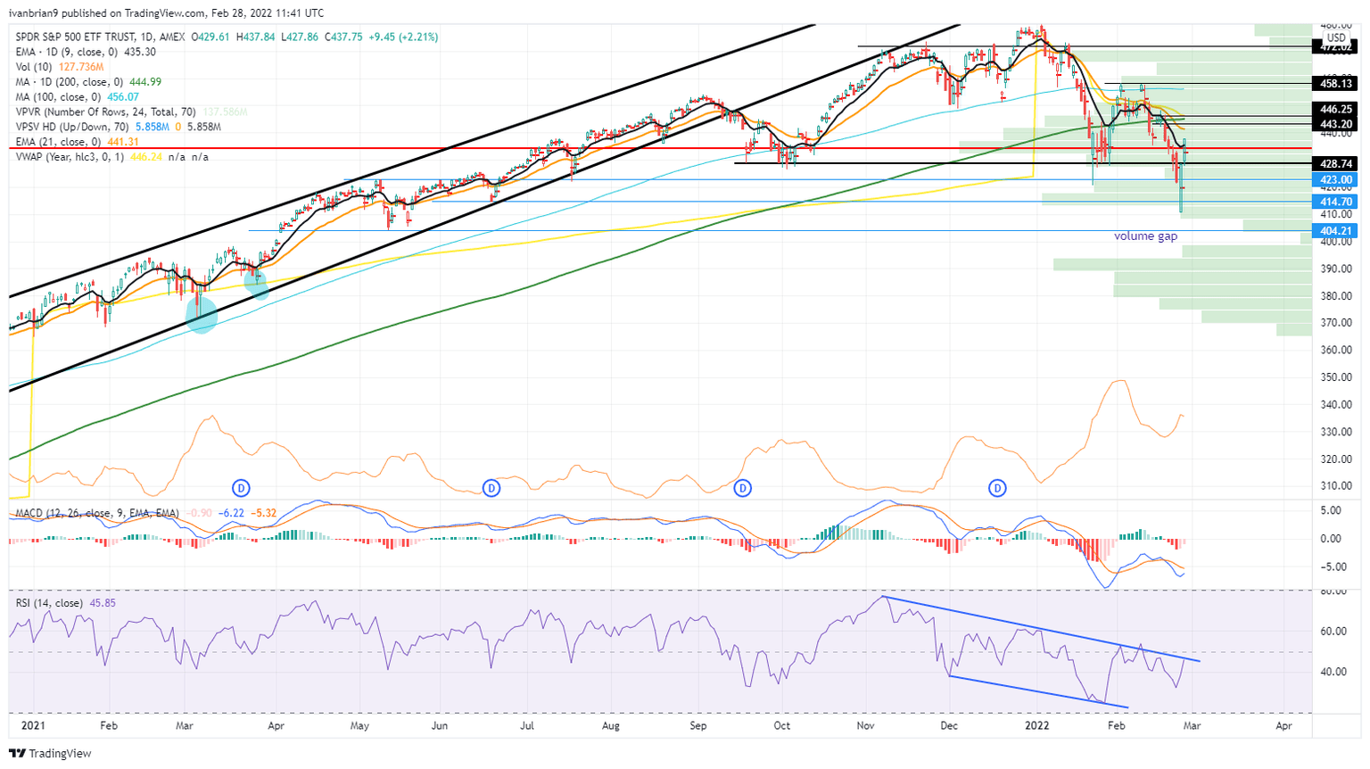 As mentioned geopolitical events are key, but technical levels have still been working well. The Moving Average Convergence Divergence (MACD) and Relative Strength Index (RSI) both remain in a strong downtrend, thereby confirming the SPY price decline. Neither are oversold, so we may have more downside to come, albeit with volatility. $414 just about held on Friday, and this level is significant as below is a volume gap until $399. A break may see a quick move there. The trend remains strongly bearish despite the powerful rally on Friday, but even this failed to break the 9 or 21-day moving averages. Not that powerful after all.