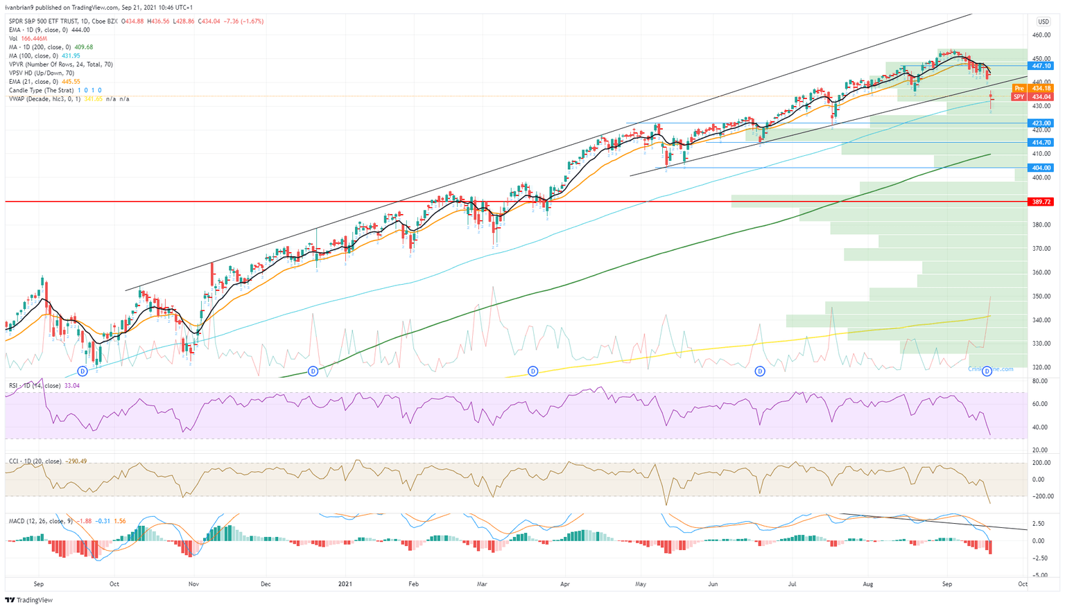 - SPY falls sharply on Monday as Evergrande concerns expand in Asia.