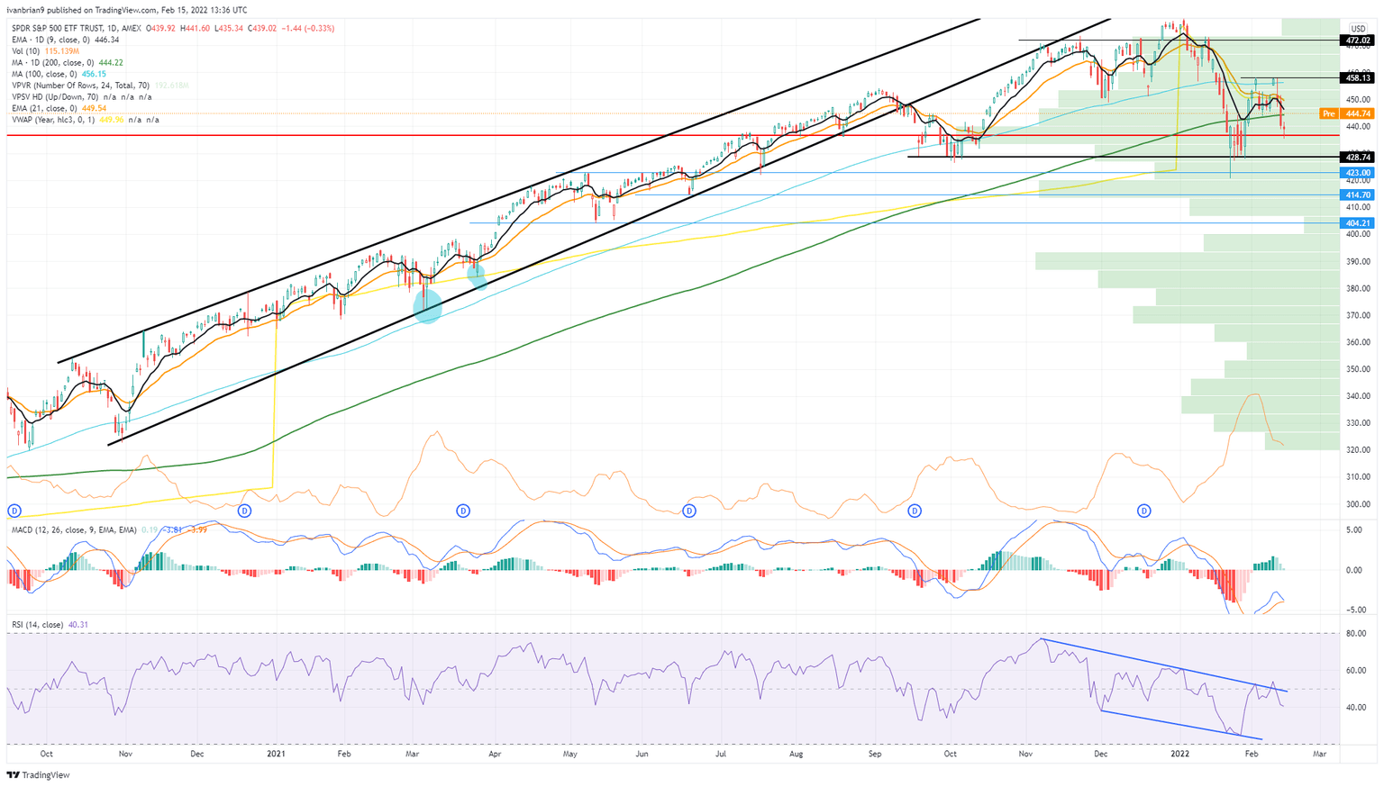 The 15-minute chart gives us some more short-term swing trading info. Volume is high around $450 for February. It has basically been the equilibrium point for February. We gapped quickly from $450 to $440 and printed a lot of volume there. So there is a volume gap between that this geopolitical calming can take advantage of. We remain in the chop zone, $428 and $458 are the pivots.