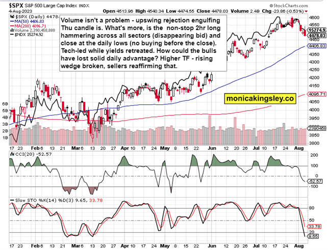 S&P 500 couldn‘t keep the fine rebound as all eyes were on „good that the job market is still OK, but maybe the Fed would stop hiking now“ interpretation of weaker than expected non-farm payrolls. Bonds certainly played ball, but it was more than the dollar that pulled stocks down – all sectors declined from whichever high they had reached intraday, in spite of yields not moving adversely. I read that 2-hours lasting disapprearance of bid as a clear warning sign that the bears have the short-term upper hand now – even if stocks attempt to retrace the downside again, the upcoming (Thursday and Friday) inflation data would show that disinflation is over (3.3 or even 3.4% headline – as inflation month on month starts adding up again through the autumn at least).