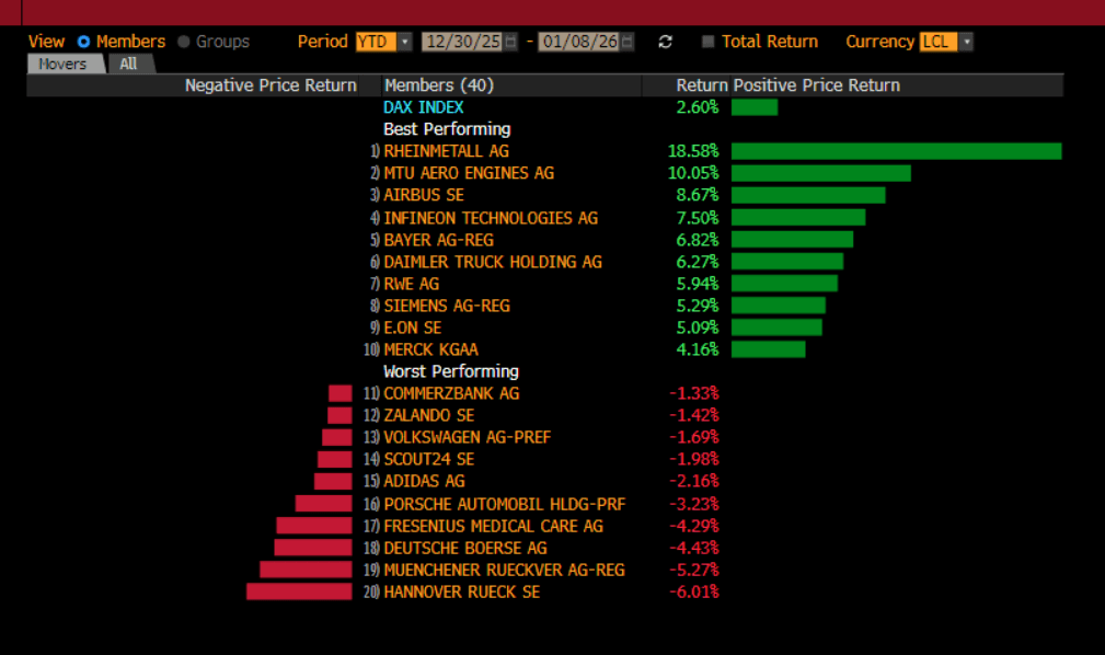 If you want to gauge the market’s view on the geopolitical situation, take a look at the early YTD performance of the FTSE 100 and the Dax. The FTSE100’S top performers are dominated by defense firms. BAE Systems, Babcock International and Rolls Royce are higher by 18%, 17% and 10% respectively. This isn’t bad for the 8th January.
