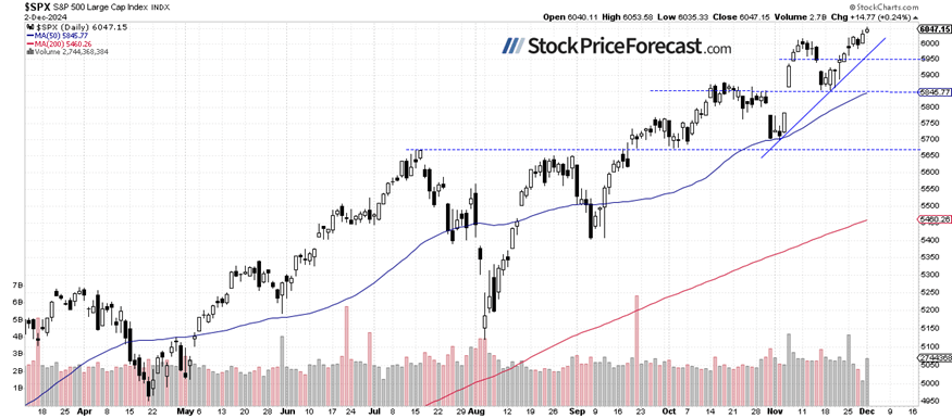 Yesterday, in my Stock Price Forecast for December 2024, I wrote “the stock market experienced a strong rally in November, driven by the presidential election outcome. While December is historically a bullish month, increased volatility and a short-term correction remain likely. The technology sector continues to underperform relative to the broader market.”