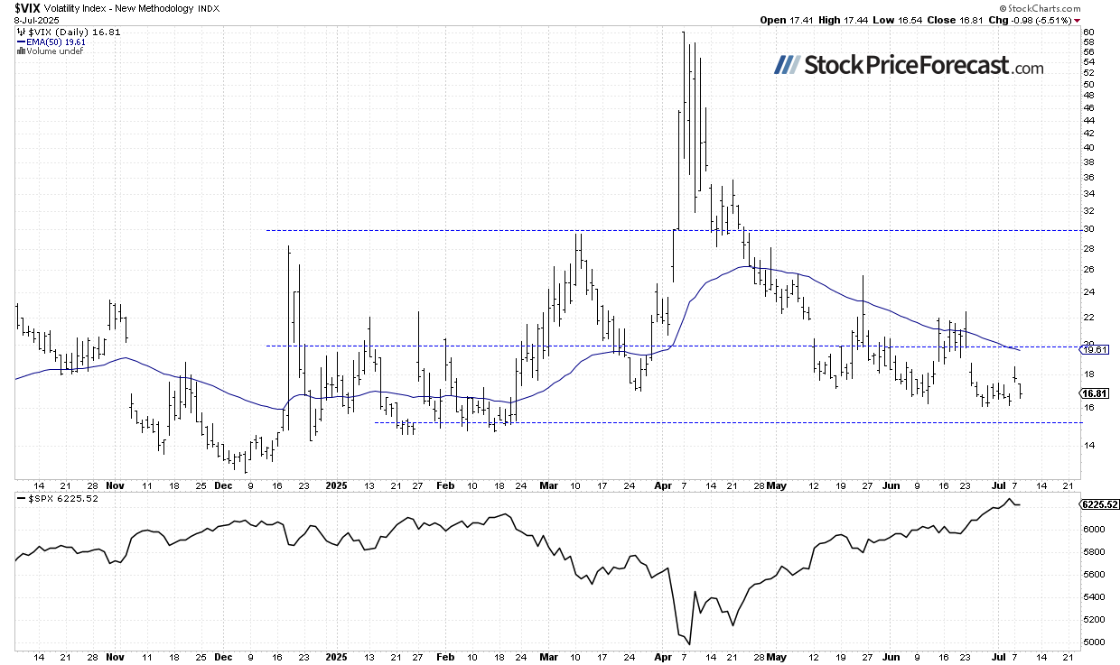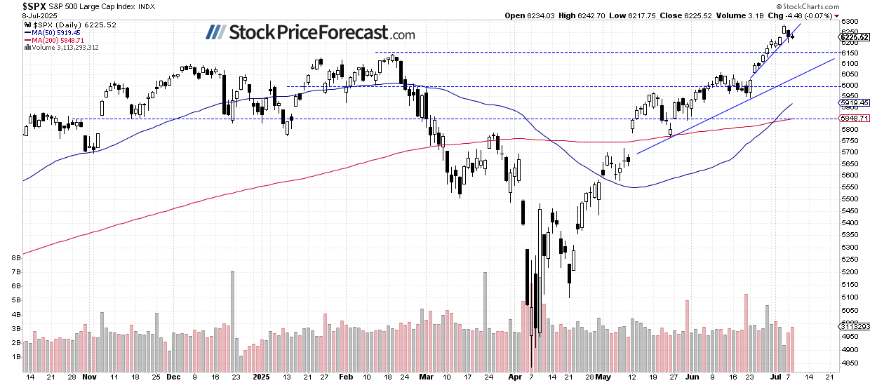 The S&P 500 Index closed 0.07% lower on Tuesday, essentially moving sideways after Monday’s pullback. The market remains mixed as investors digest recent tariff-related news and economic data. Today, the index is set to open 0.2% higher, according to futures contracts. The S&P 500 remains relatively close to Friday’s new record high of 6,284.65.