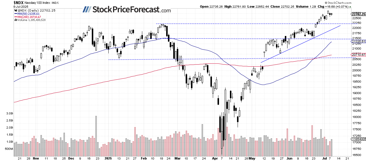 The Nasdaq 100 gained 0.07% on Tuesday, remaining within Monday’s trading range. After hitting a new all-time high of 22,896.01 on Friday, it pulled back to a low of 22,587.47 on Monday. This appears to be a brief correction, with no confirmed negative signals evident at this point.
