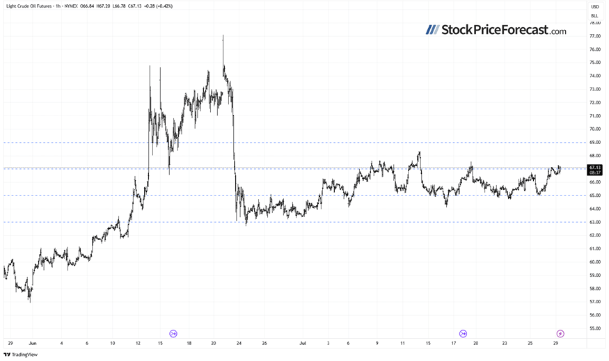 Crude oil gained 2.38% on Monday, benefiting from easing tariff concerns following the weekend’s U.S.–EU trade deal. The market is now retesting its recent highs and extending a short-term consolidation. As of this morning, prices are up 0.7%, nearing the $67 level.