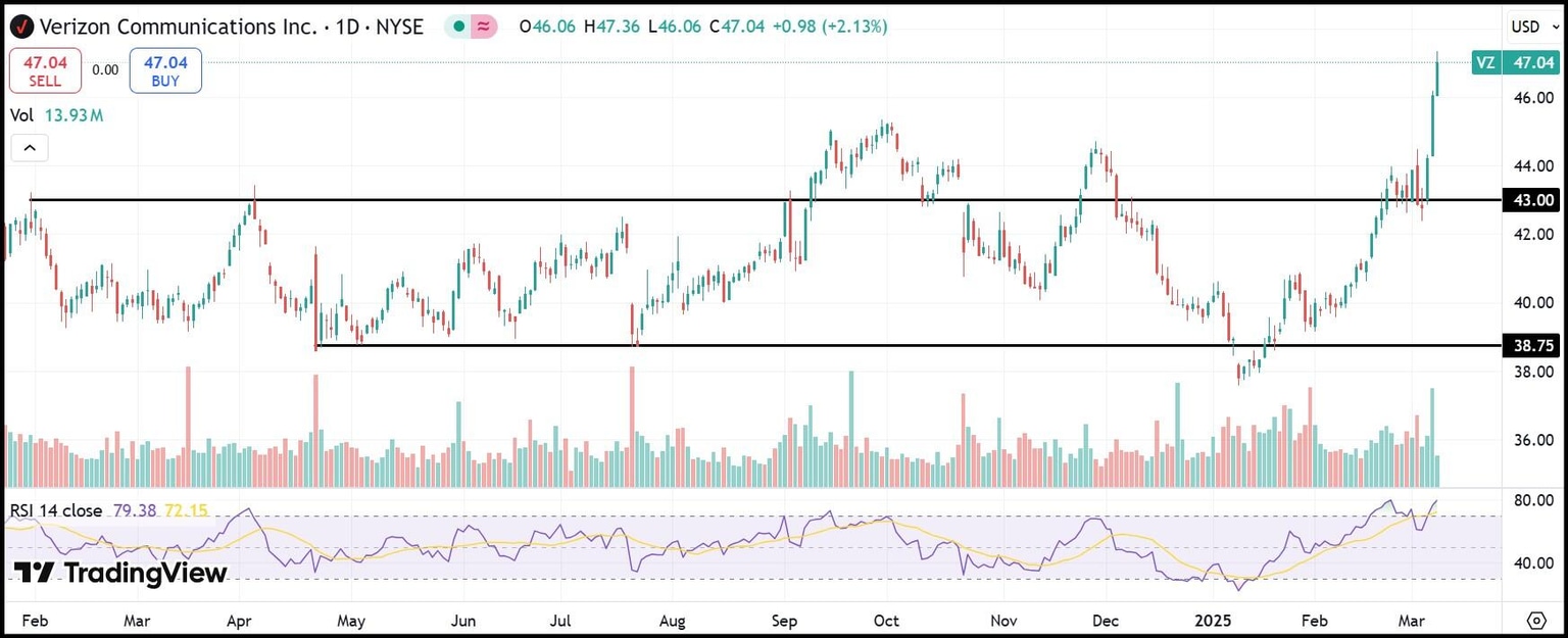 Verizon stock is trading at its highest point in nearly three years. Traders must scan back to July 2022 in order to see a time when VZ shares transcended the $47 price level. Verizon's stock price is up over 17% year to date.