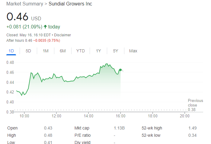 UPDATE: Sundial Gowers finished Monday up 21.09% at $0.46 per share, overcoming the sour tone of the Nasdaq Composite. The index finished the day down 142 points or 1.20%. The Dow Jones Industrial Average managed to add 26 points, while the S&P 500 shed 0.23%. The cannabis producer company soared ahead of the Q1 earnings report. SNDL is back after losing ground for the last three weeks, and currently advancing on the back of speculation the cannabis industry will benefit from fresh US legislation.