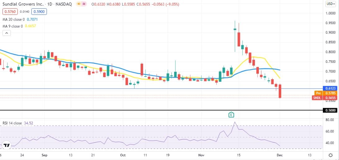 Sundial Growers (SNDL) stock dropped another 9% to $0.5655 on Wednesday. This arrives after the 2.1% fall in Tuesday's session. SNDL stock has dropped 41% since mid-November's range high, which was a product of better than expected Q3 earnings. The cannabis grower and distributor saw its stock rebound 2.7% to $0.5810 in Thursday's premarket.