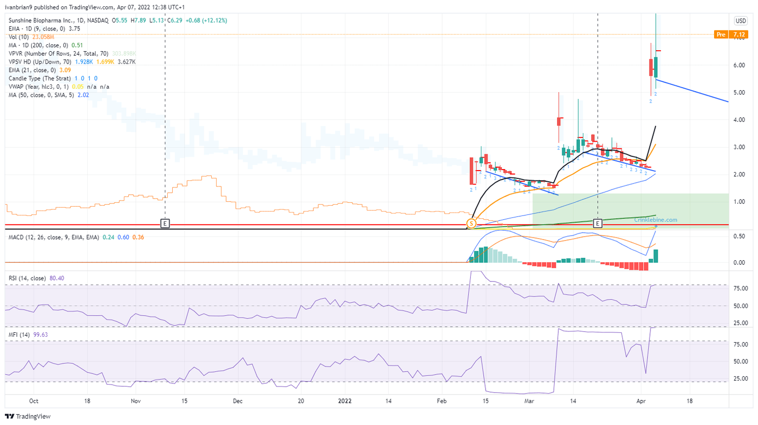 Update: Sunshine BioPharma keeps capitalizing on a breakthrough treatment for breast and ovarian cancer. The pharma company announced earlier in the week that it had discovered a successful mRNA treatment for these illnesses, which has helped SBFM skyrocket. Within the first hour of Thursday's Wall Street trading, the Canadian pharmaceutical shares are up another 27% at the time of writing, right at the $8 mark, having set an $8.18 high in the past minutes. This makes it a 235% rise in the past two days since the announcement. Technical analysis is helpless within this kind of volatility, so momentum trading is what matters now for SBFM stock.