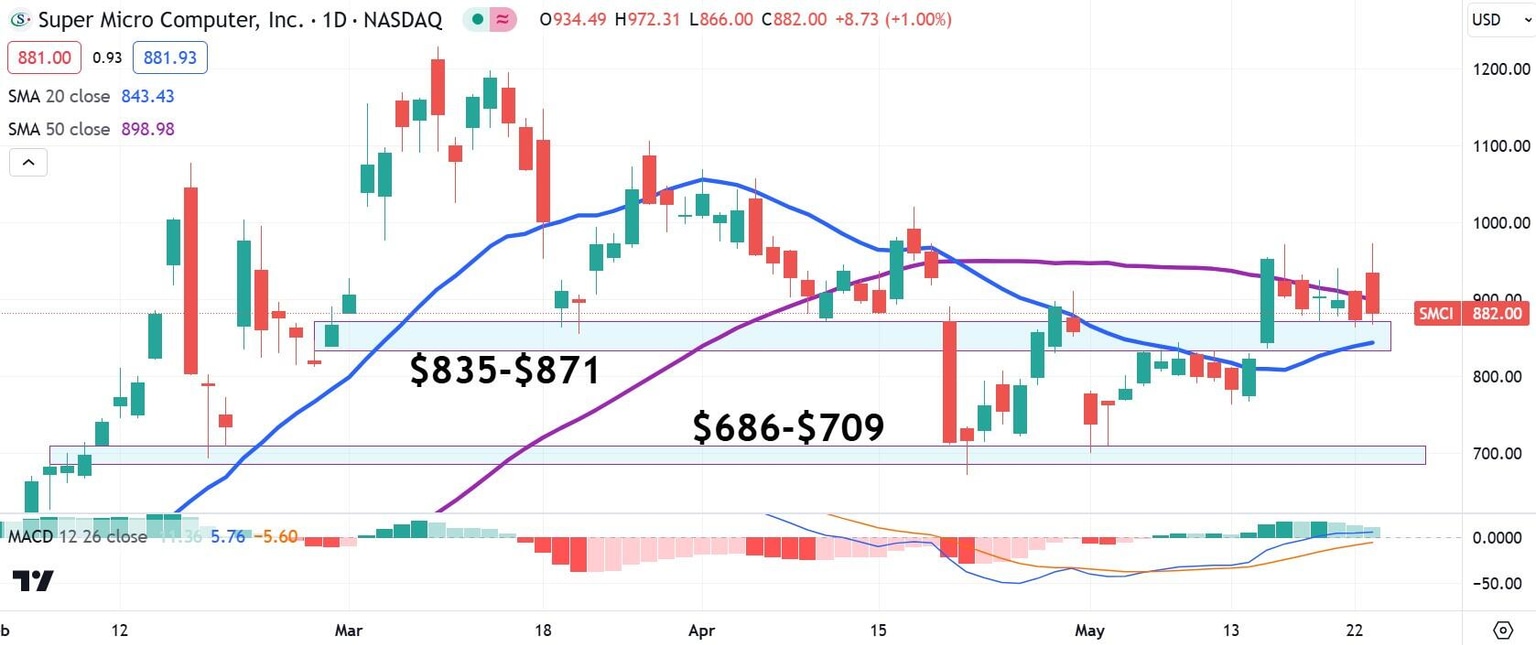 SMCI stock did bounce off support in the $835 to $871 range, but it's unlikely that will hold. SMCI stock is already trading beneath the 50-day Simple Moving Average (SMA), which is bearishly trading above the 20-day SMA. A better bet is the support band ranging from $686 to $709 that stems from February price dynamics.