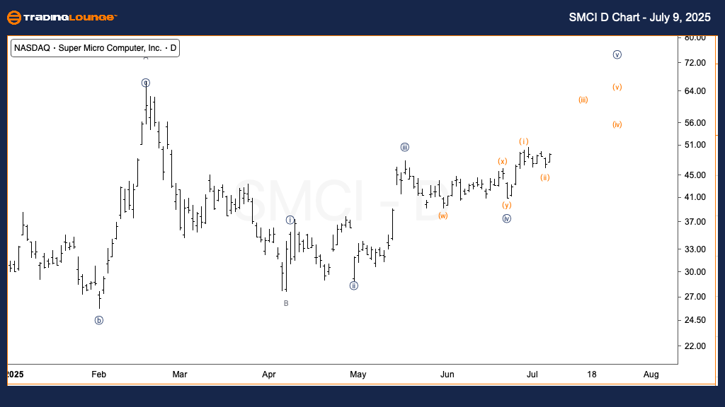 On the daily chart, SuperMicro Computers Inc. (SMCI) is in the last stage of a corrective flat pattern that began at the start of 2025. The stock is currently advancing through wave {v} of C, indicating that the countertrend structure is nearly complete. This upward move is expected to form the final leg in the ongoing correction before the larger trend resumes.