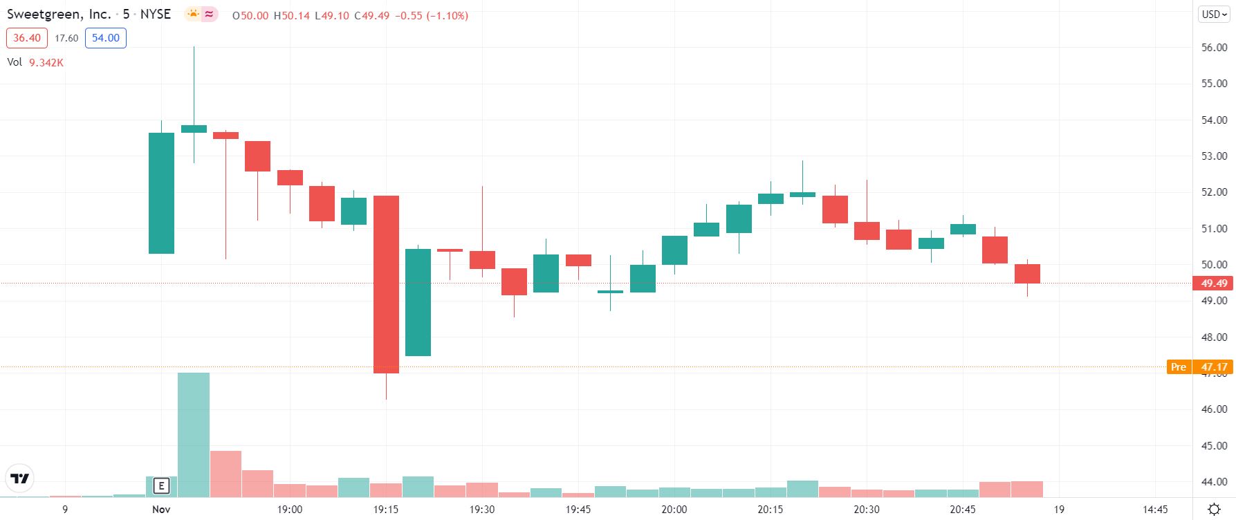 While there is not much to deduce from a stock that has only traded a bit over two hours in its public existence, Thursday's low of $46.01 appears to be the most important support level. If SG prices crosses this level, then Sweetgreen stock could take a greater stumble. Addtionally, there appears to be some support around $49. Three times during the session when SG stock approached here, shares were bought up.
