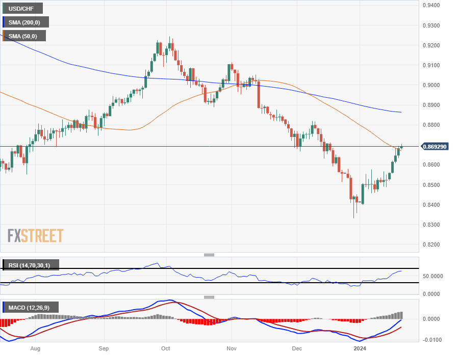 The USD/CHF is set for its first technical challenge since finding the floor in late December, with the pair pushing directly into technical resistance from the 50-day Simple Moving Average (SMA) in the back half of the week’s trading.