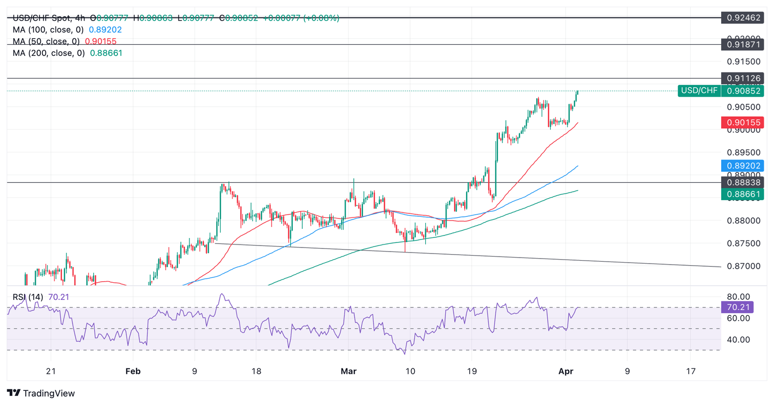 USD/CHF – the number of Swiss Francs that can be bought with one US Dollar (USD) – extends its uptrend.