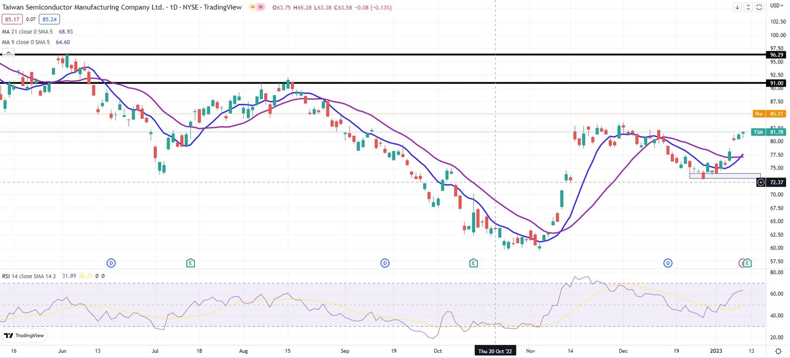 TSM stock's premarket rally has pushed it above the resistance zone at and slightly above the $83 price level. This means that with the new range high achieved bulls will now focus on the next profit-taking levels at $91 and $96.29. These levels worked as resistance in mid-August and late May, respectively. The 9-day moving average has just crossed over the 21-day moving average, which is typically a harbinger of a rally. Expect this one to have legs, but watch out for the Relative Strength Index (RSI) entering overbought territory. Currently, the RSI already reads above 63 on the daily chart below. TSM should be able to find support back at recent resistance near $83 or where the two moving averages crossed over eachother just above $77.