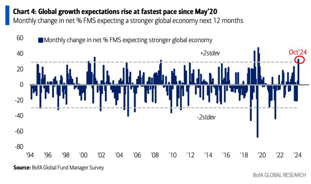 Despite the doomsayers, BoA’s latest Global Fund Manager survey shows global growth expectations surging from -47% to -10%, one of the biggest jumps since 1994. Between the Fed’s rate cut, China’s stimulus attempts (which might finally stem the bleeding), and September’s blowout US jobs report, it’s becoming clear that smart money is backing the rally.