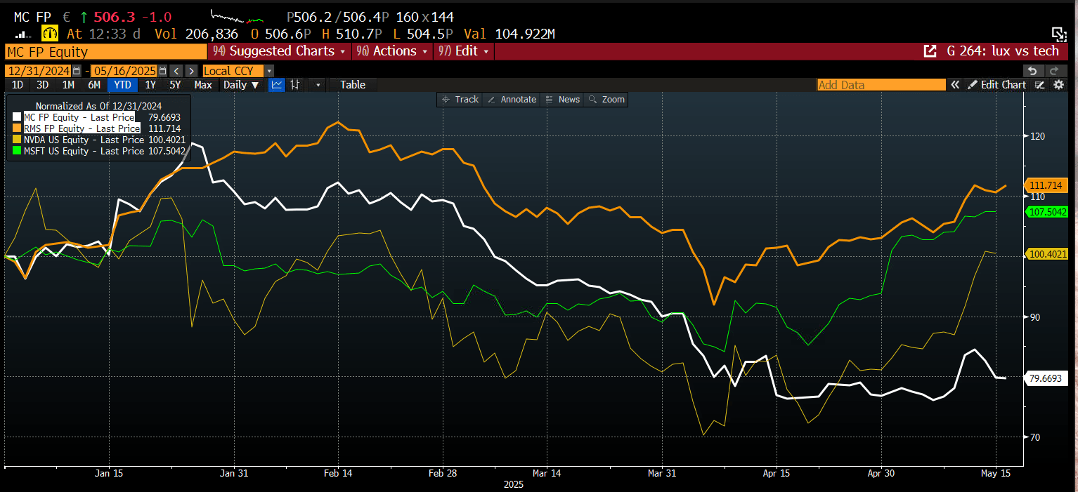Chart 3: LVMH, Hermes, Nvidia and Microsoft, normalized to show how they move together YTD