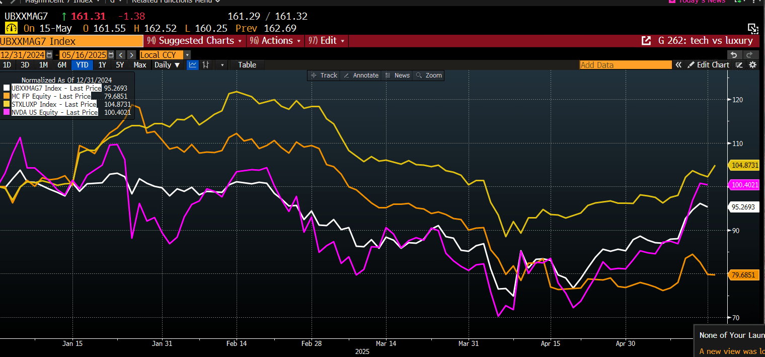 Hermes is still the top performer and is outperforming both Nvidia and Microsoft so far in 2025, as it reported decent sales for Q1. Luxury is still an important segment of the market for Europe, as you can see by Hermes’ continued outperformance of the US tech giants this year. However, it does suggest that the luxury sector in Europe is fragmenting. Europe’s biggest luxury houses are no longer moving to the beat of the same drum and their earnings outlooks are diverging. As LVMH weakens, it suggests that Europe’s luxury sector is losing an important pillar of support as we move through Q2, which could hinder the ability of European indices to outperform US stocks, especially now that tech is in recovery mode.