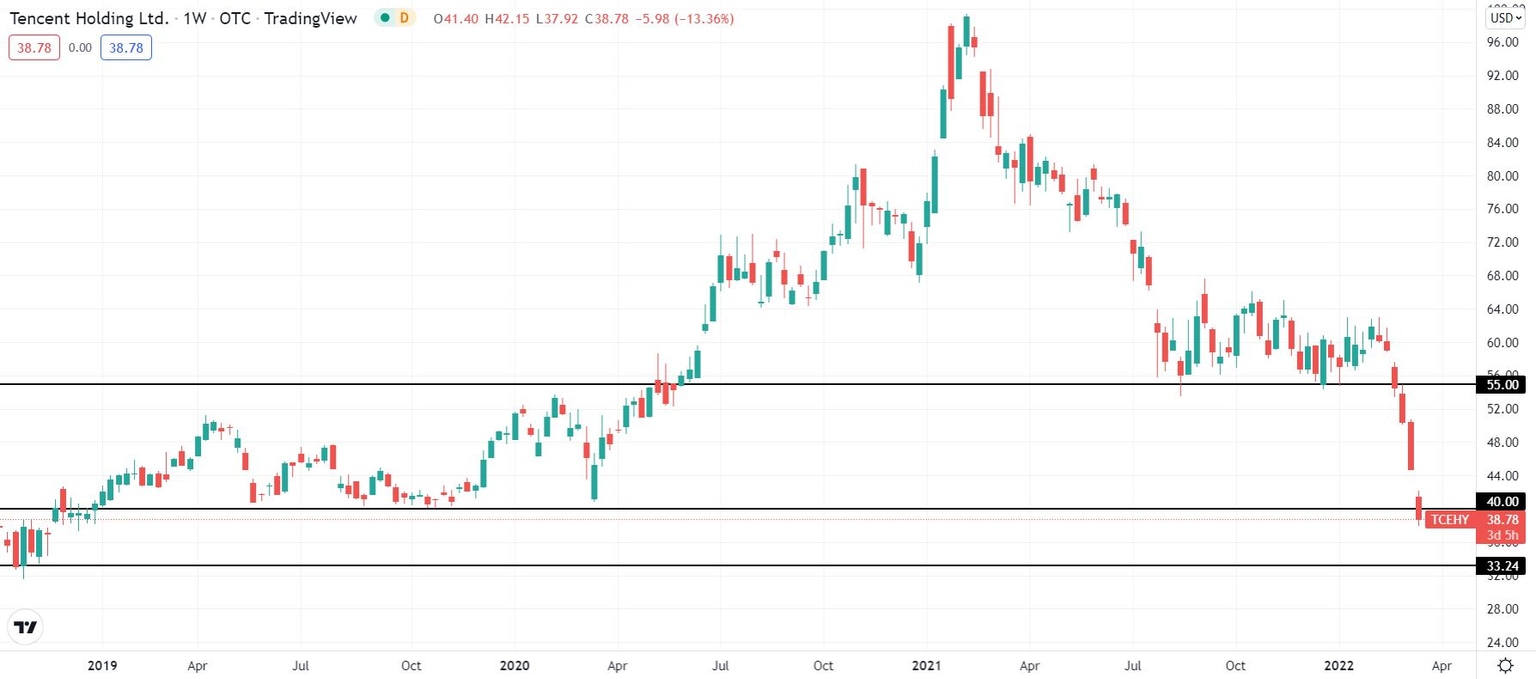 Tencent stock has not traded below $40 since December 2018 and first trade here in the summer of 2017. Shares of the digital conglomerate were already down by about 40% last year but have fallen by about a third just since the advent of Russia's invasion of Ukraine.