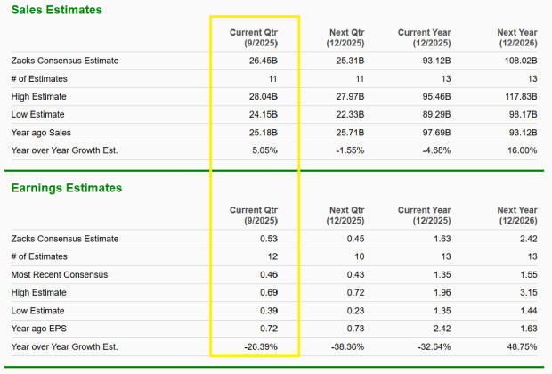 Zacks Consensus Estimates suggest tepid sales growth and negative EPS growth until 2026. Wall Street expects Q3 revenue of $26.45B (+5.05%), with EPS of $0.53 (-26.39%).