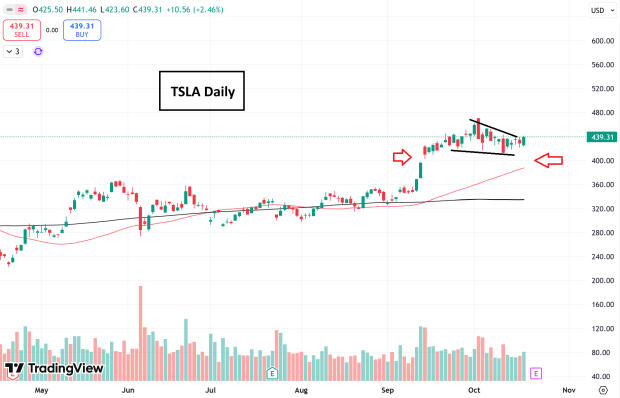 After breaking out from a low-level base structure in September, TSLA shares are coiling in a classic bull flag pattern. If Tesla exceeds expectations, the stock should make a run at its previous all-time high of $488. Should TSLA miss expectations, the stock is likely to test the confluence of the open price gap and rising 50-day moving average ~$400.