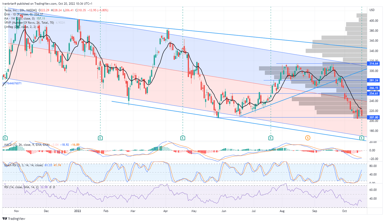 Here we go again with another test of support at $207 coming up. The rise in bond yields is not helping Tesla's cause and added pressure from earnings could see the $207 level finally break. That would in my view lead to a target of $160, which is the lower trend line and the 200-week moving average. If $207 can hold, then a period of stabilization would target $254 and the gap to $266. That will need a broad equity market rally, I believe, as sentiment toward Tesla will be clouded by this earnings report. $207 is the key pivot.