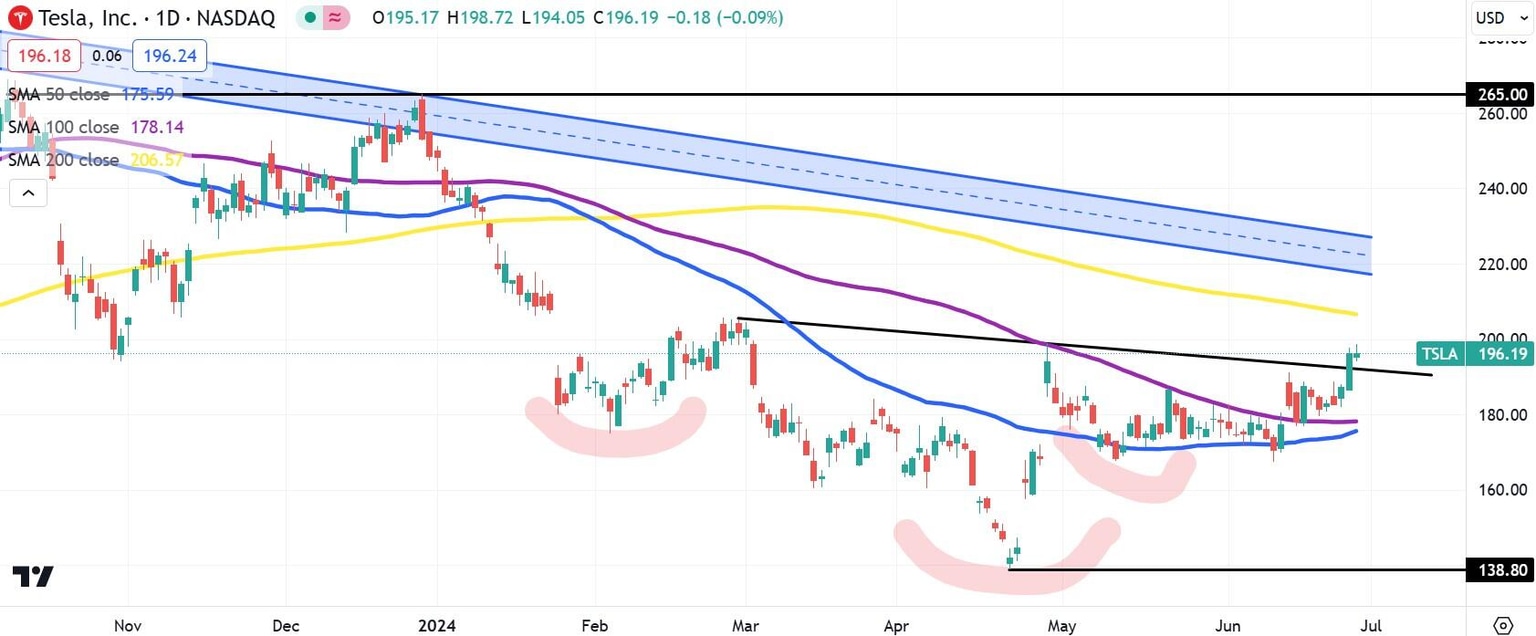 - Tesla has overcome the neckline of an Inverse Head & Shoulders pattern, which is bullish.