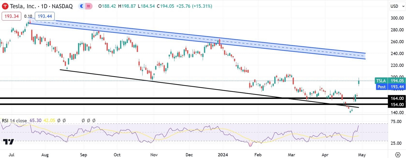Tesla stock has been ricocheting within a downward trending price channel since July 2023. It broke through the lower bound of that channel just this past month, but now the price action has bounced back into the channel again.