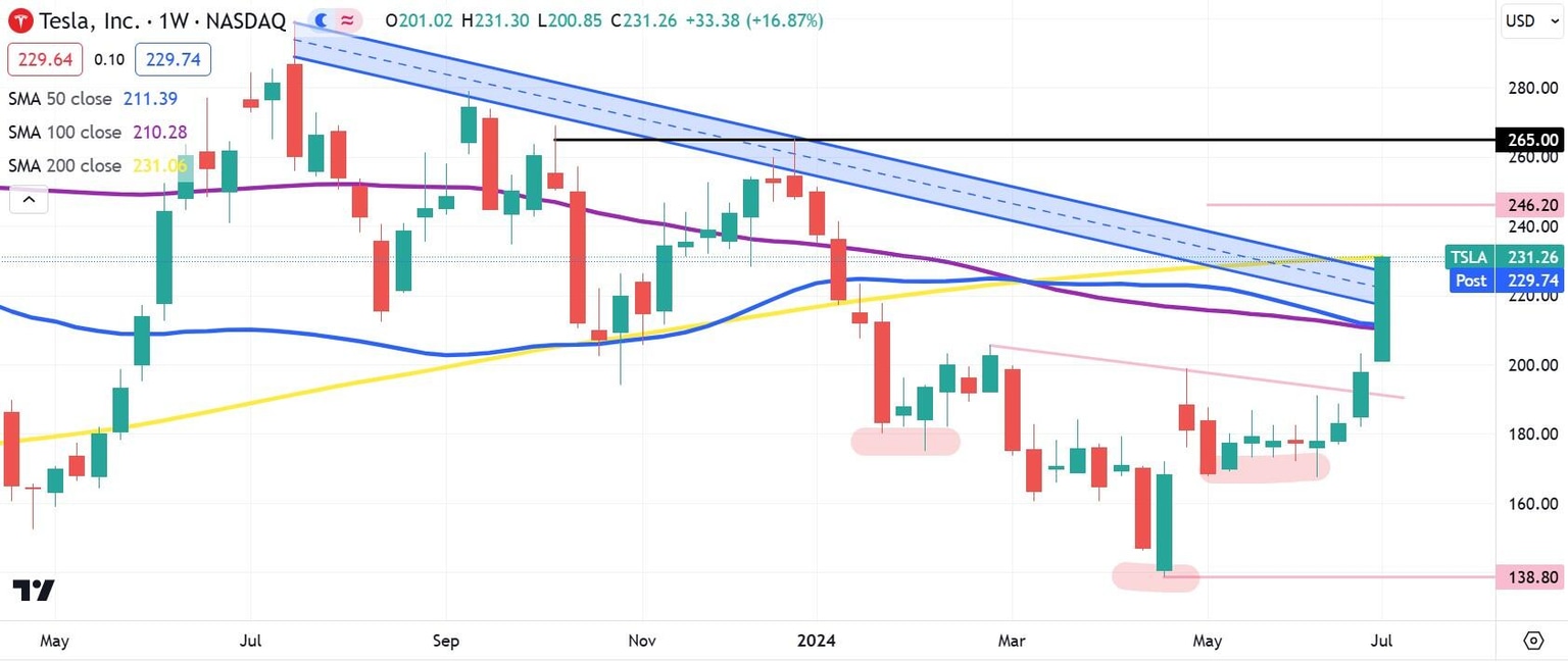 TSLA stock is trading above its 200-week Simple Moving Average (SMA) for the first time since January as well. From here, the projected price target of the Inverse Head-and-Shoulders pattern (seen in pink) is $246.20. Above there lies historical resistance near $265. Happy trading.