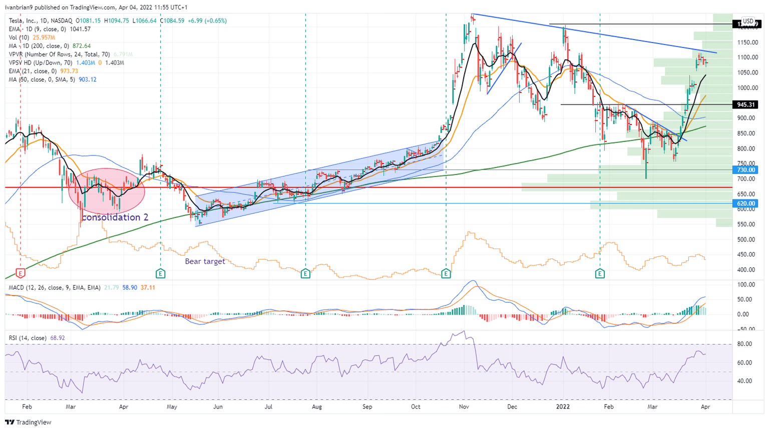 Tesla stock has made a strong recovery from the Ukraine lows and like most stocks has rallied significantly. Breaking $945 was key, and now the momentum is behind the stock. The delivery numbers should underpin recent gains. The next big resistance comes at $1,210. Note the Relative Strength Index (RSI) getting close to overbought.