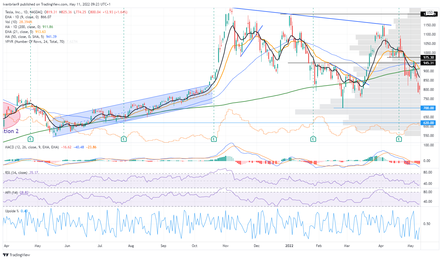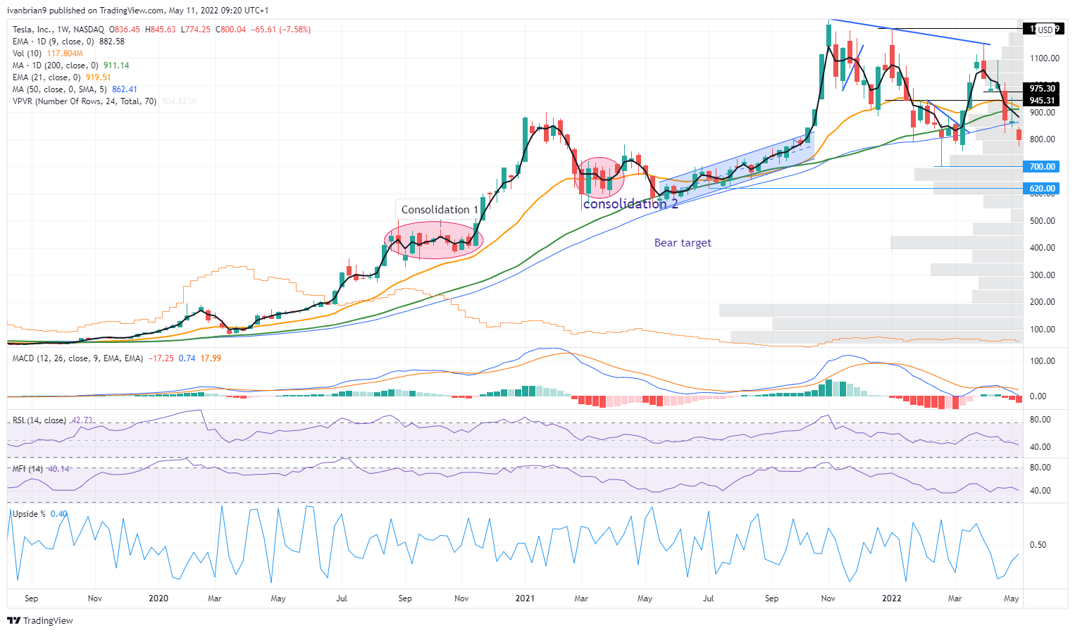The Twitter (TWTR) deal still lingers on in the background with no fresh updates. This has cast a pall over TSLA stock lately as it appeared Elon Musk had to pledge large amounts as collateral. This led to a sharp fall in Tesla stock, but the price has since stabilized on Tuesday. Macro factors are the main driver of equity prices currently, and Wednesday's CPI number will be the next big catalyst. Recent bearishness can be put into perspective by looking at the big picture on the weekly chart.